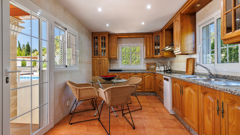 Se trata de una villa que tiene dos alturas, en la parte inferior consta de una suite independiente que tiene un dormitorio con cama de matrimonio, un baño y el salón. En la parte superior que es más amplia, consta de un salón con chimenea y comedor, además de una cocina separada y completa, ambos comunican con la zona de piscina. Asimismo, en esta parte superior también hay tres dormitorios con una cama de matrimonio en cada uno, y dos baños independientes.
