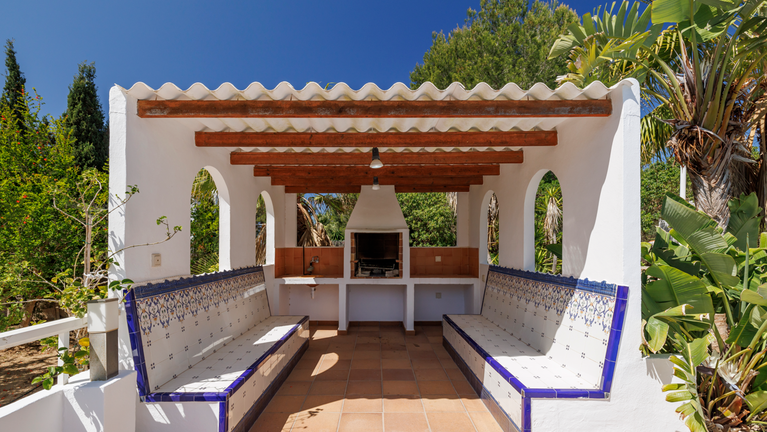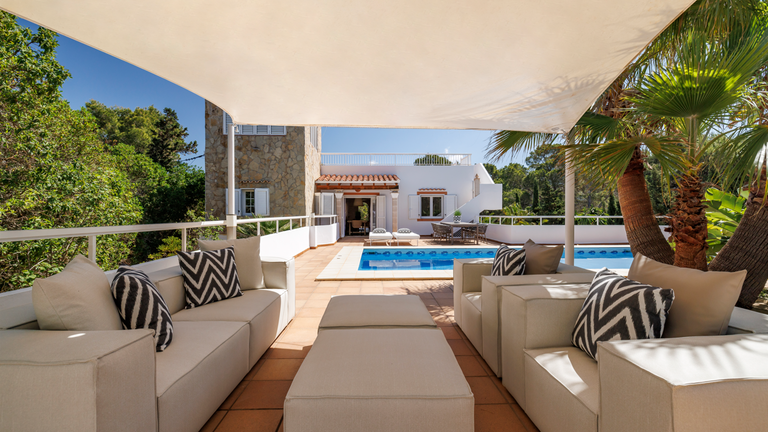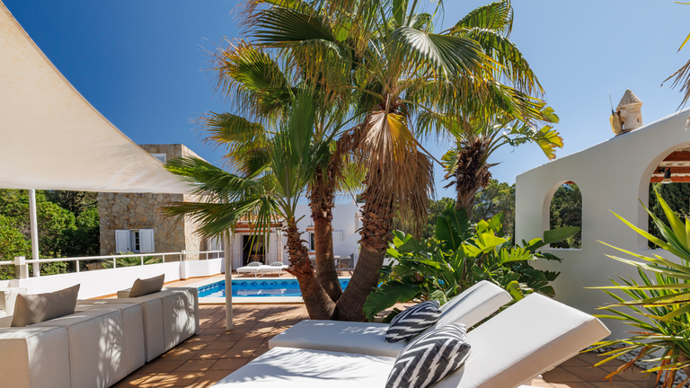 En la parte exterior hay una zona de solarium con hamacas, barbacoa y piscina. Desde la terraza superior que corona el ático de la villa es posible contemplar los atardeces más espectaculares de Ibiza y, a lo lejos, la isla de Es Vedrà.